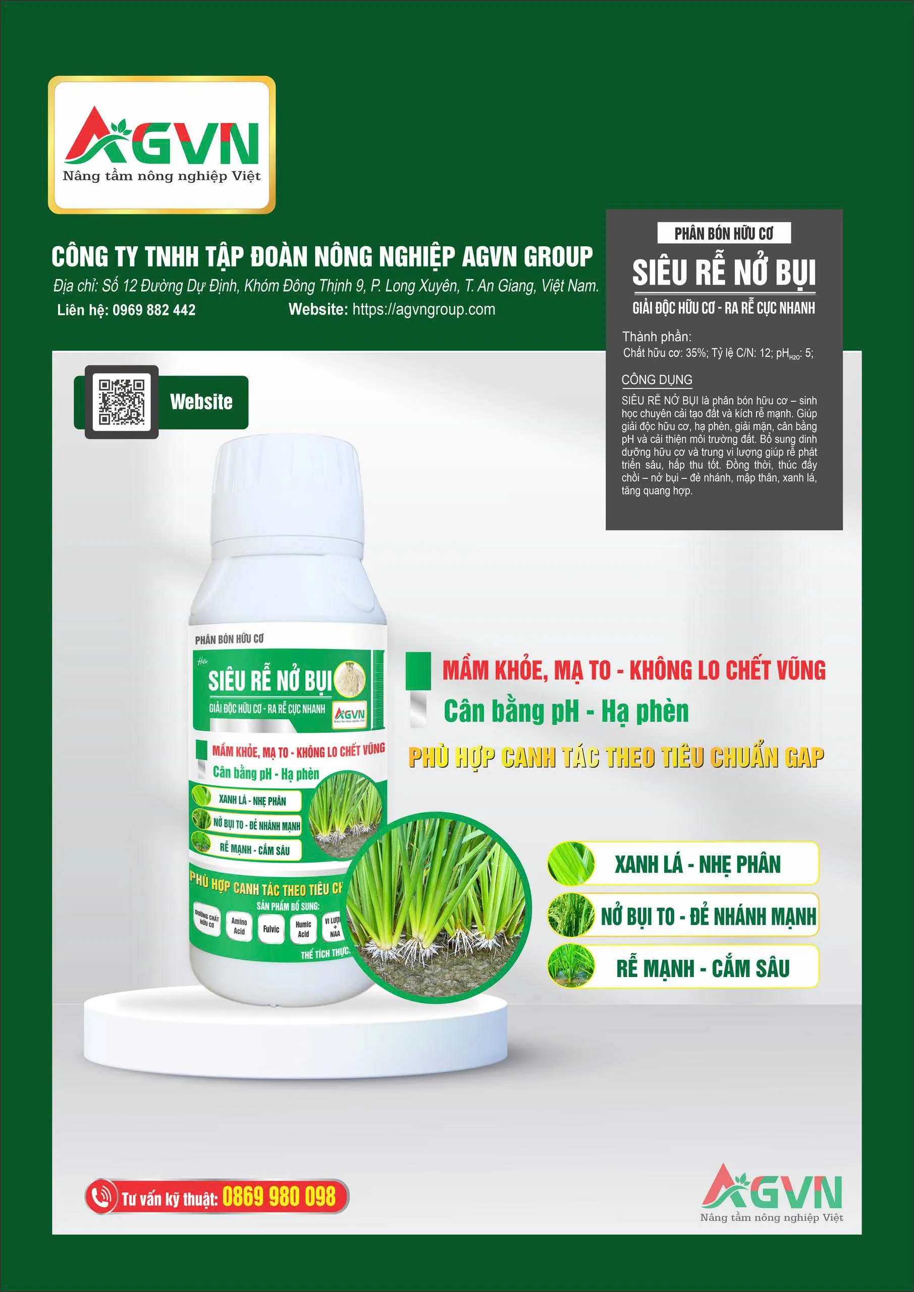 SIÊU RỄ NỞ BỤI là phân bón hữu cơ - sinh học có khả năng cải tạo đất và kích thích ra rễ cực mạnh. Giúp giải độc hữu cơ, hạ phèn, giải mặn, cải thiện môi trường đất, tạo điều kiện lý tưởng cho rễ phát triển. Với nguồn dinh dưỡng hữu cơ cao cấp và nguyên tố đa trung vi lượng giúp bộ rễ phát triển mạnh, cắm sâu giúp tăng tối đa khả năng hấp thu chất dinh dưỡng ở điều kiện bất lợi. Ngoài ra, sản phẩm còn thúc đẩy cây tăng chồi, nở bụi, đẻ nhánh, mập thân. Hỗ trợ cân bằng pH, kích thích cây xanh lá, dày lá, tăng khả năng quang hợp.