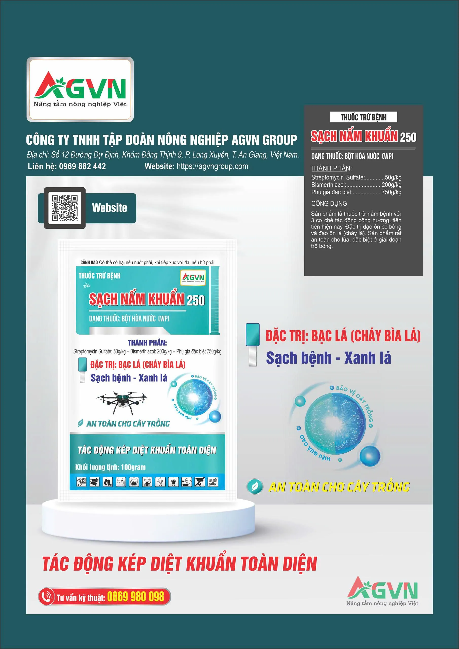 Với sự kết hợp của 2 hoạt chất Streptomycin Sulfate (kháng sinh) Kháng từ bên trong kháng ra và Bismerthiazol (hóa học) hấp thụ từ bên ngoài vào tạo sự gọng kìm. Hiệu quả cao trên vi khuẩn.